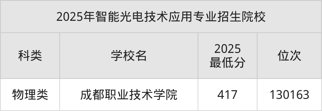 因为各校在不同省市区的收分不一样,为方便对比,这里以贵州省高考为例,列举上述院校2025年在贵州智能光电技术应用招生分数情况。