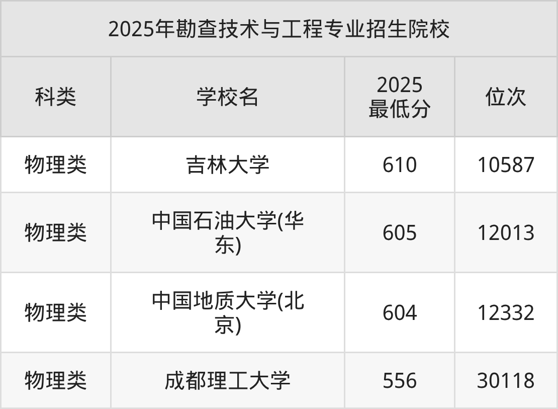 数据显示,勘查技术与工程最好大学的收分在556分及以上,其中吉林大学最低分达到了610分,对应最低位次为10587名。