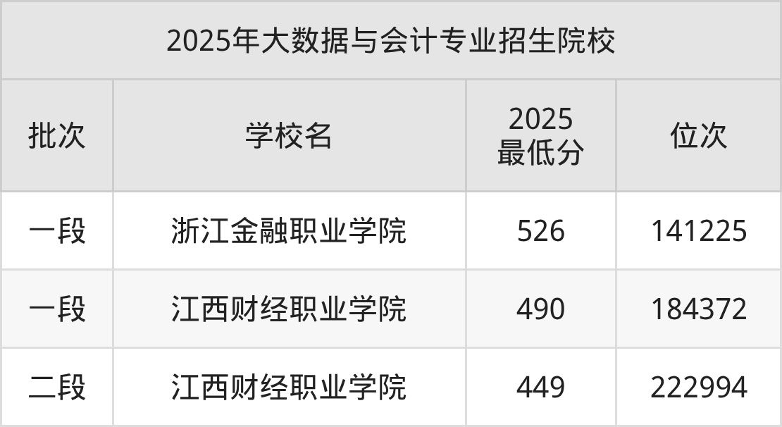 数据显示,大数据与会计最好大学的收分在449分及以上,其中浙江金融职业学院最低分达到了526分,对应最低位次为141225名。
