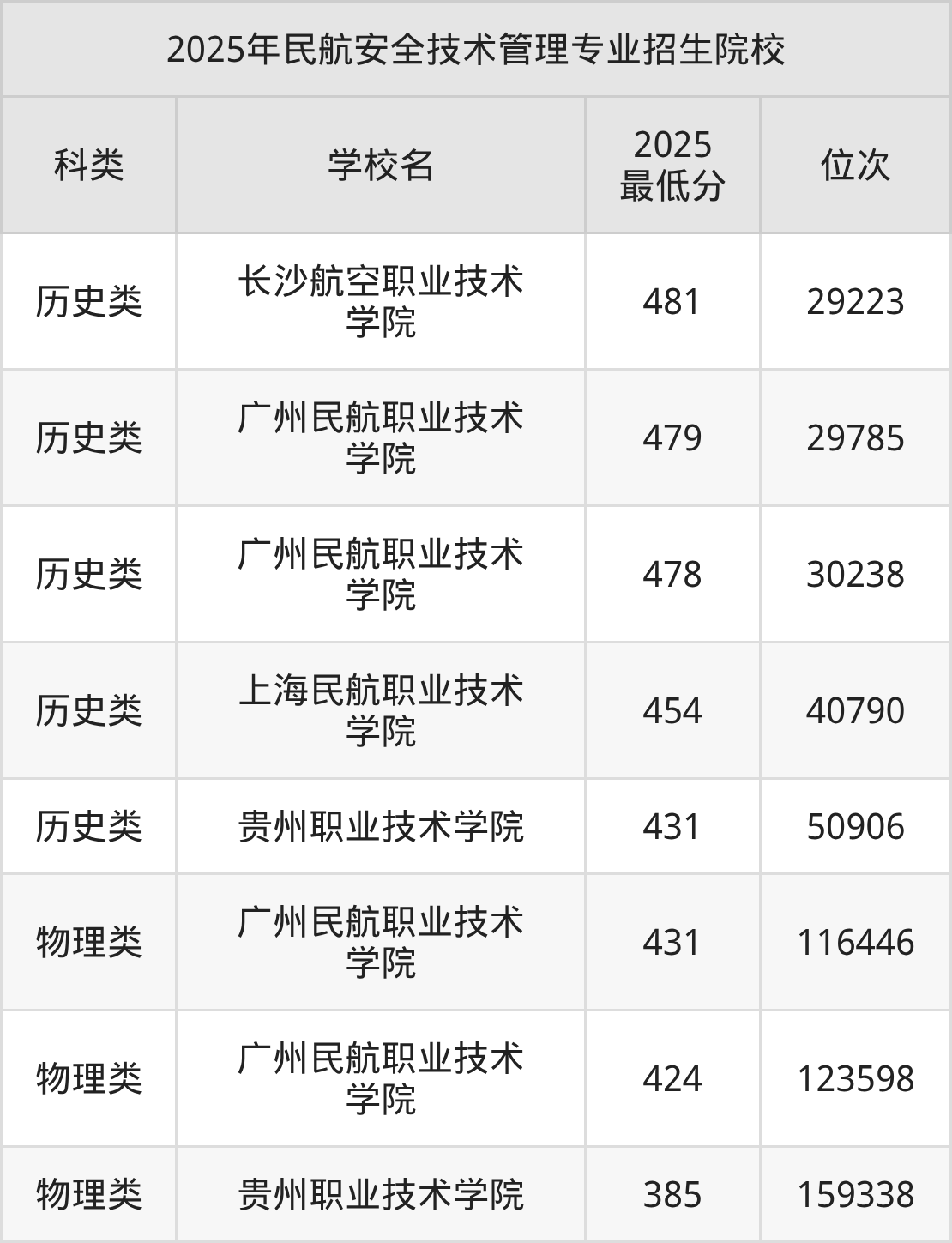 因为各校在不同省市区的收分不一样,为方便对比,这里以贵州省高考为例,列举上述院校2025年在贵州民航安全技术管理招生分数情况。