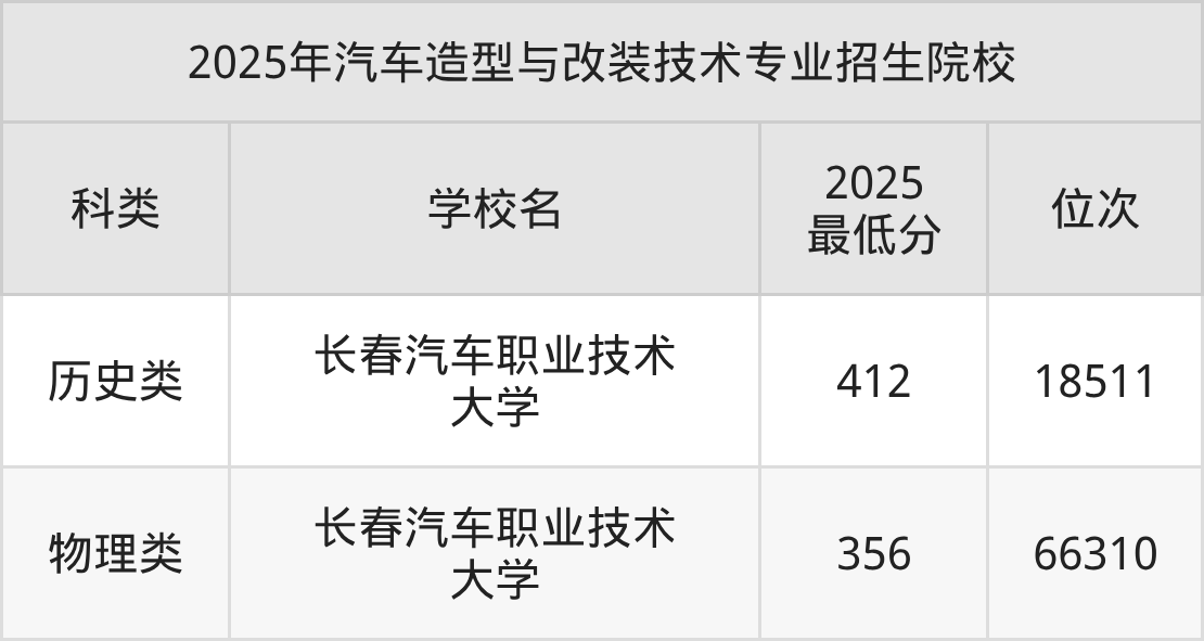 因为各校在不同省市区的收分不一样,为方便对比,这里以吉林省高考为例,列举上述院校2025年在吉林汽车造型与改装技术招生分数情况。