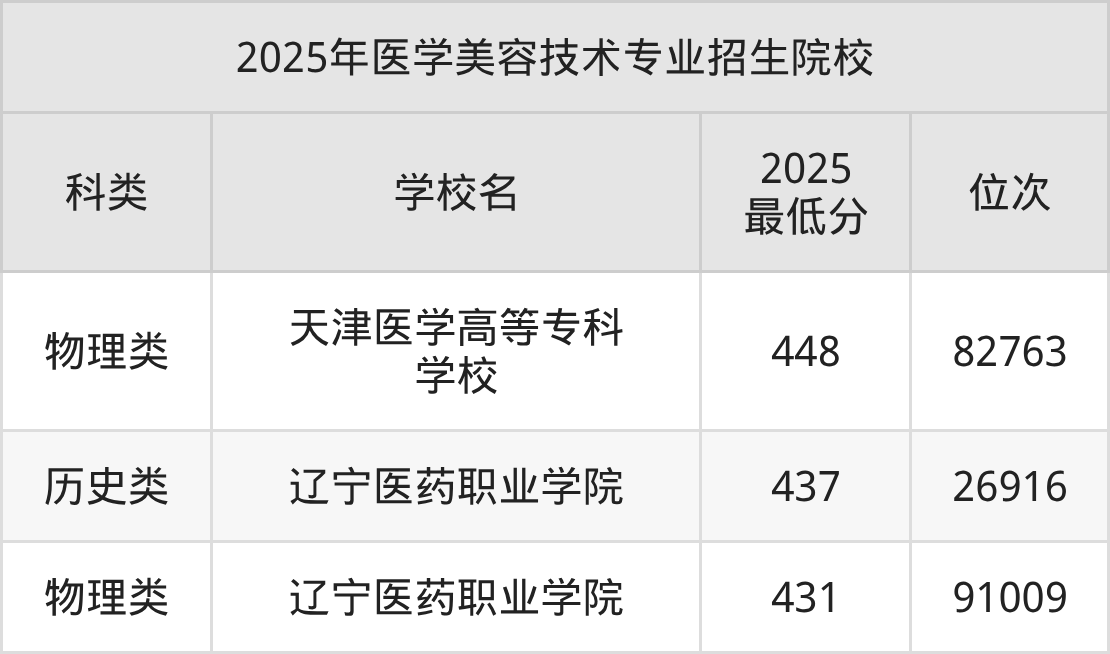 数据显示,医学美容技术最好大学的收分在431分及以上,其中天津医学高等专科学校最低分达到了448分,对应最低位次为82763名。