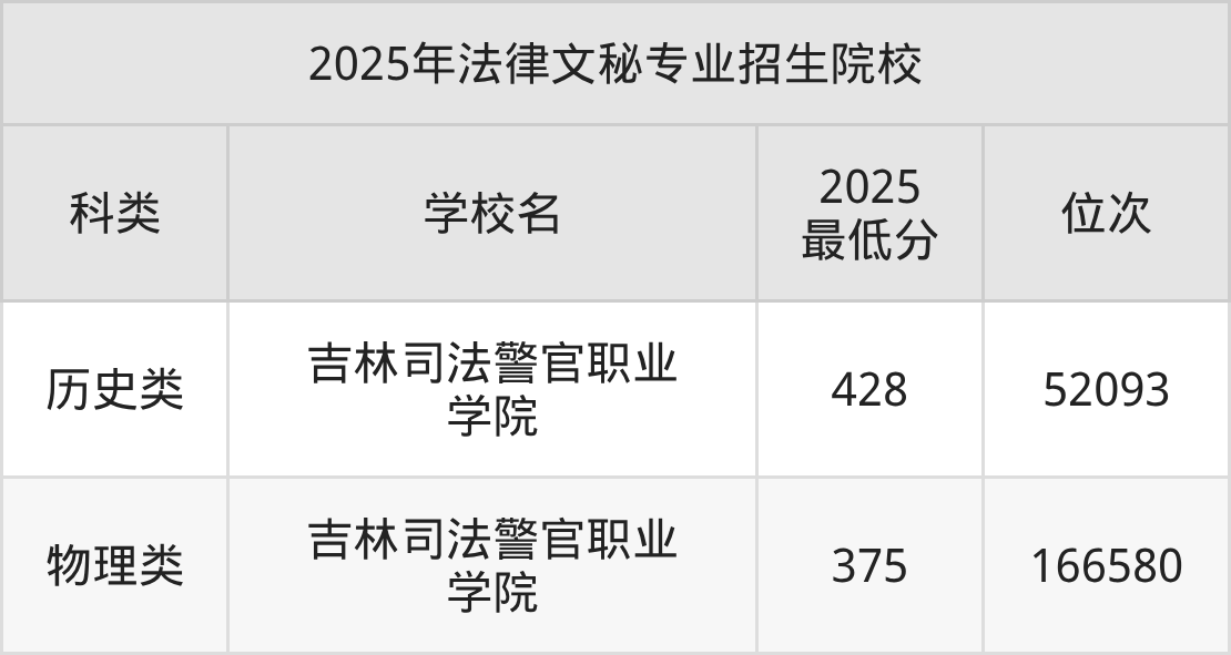 数据显示,法律文秘最好大学的收分在375分及以上,其中吉林司法警官职业学院最低分达到了428分,对应最低位次为52093名。