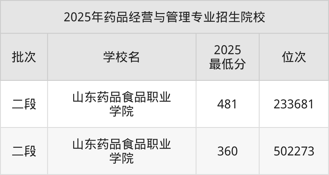 因为各校在不同省市区的收分不一样,为方便对比,这里以山东省高考为例,列举上述院校2025年在山东药品经营与管理招生分数情况。