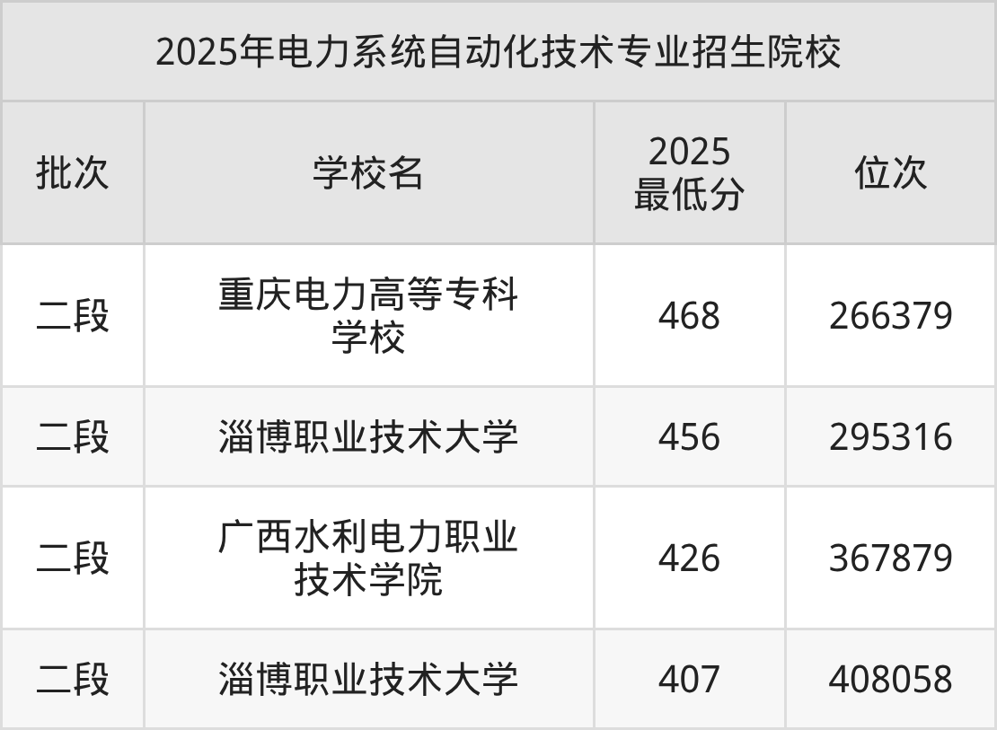 数据显示,电力系统自动化技术最好大学的收分在407分及以上,其中重庆电力高等专科学校最低分达到了468分,对应最低位次为266379名。