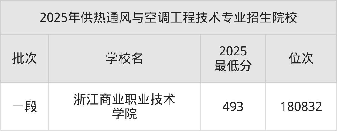 因为各校在不同省市区的收分不一样,为方便对比,这里以浙江省高考为例,列举上述院校2025年在浙江供热通风与空调工程技术招生分数情况。