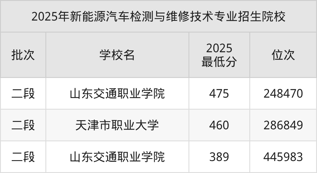 因为各校在不同省市区的收分不一样,为方便对比,这里以山东省高考为例,列举上述院校2025年在山东新能源汽车检测与维修技术招生分数情况。