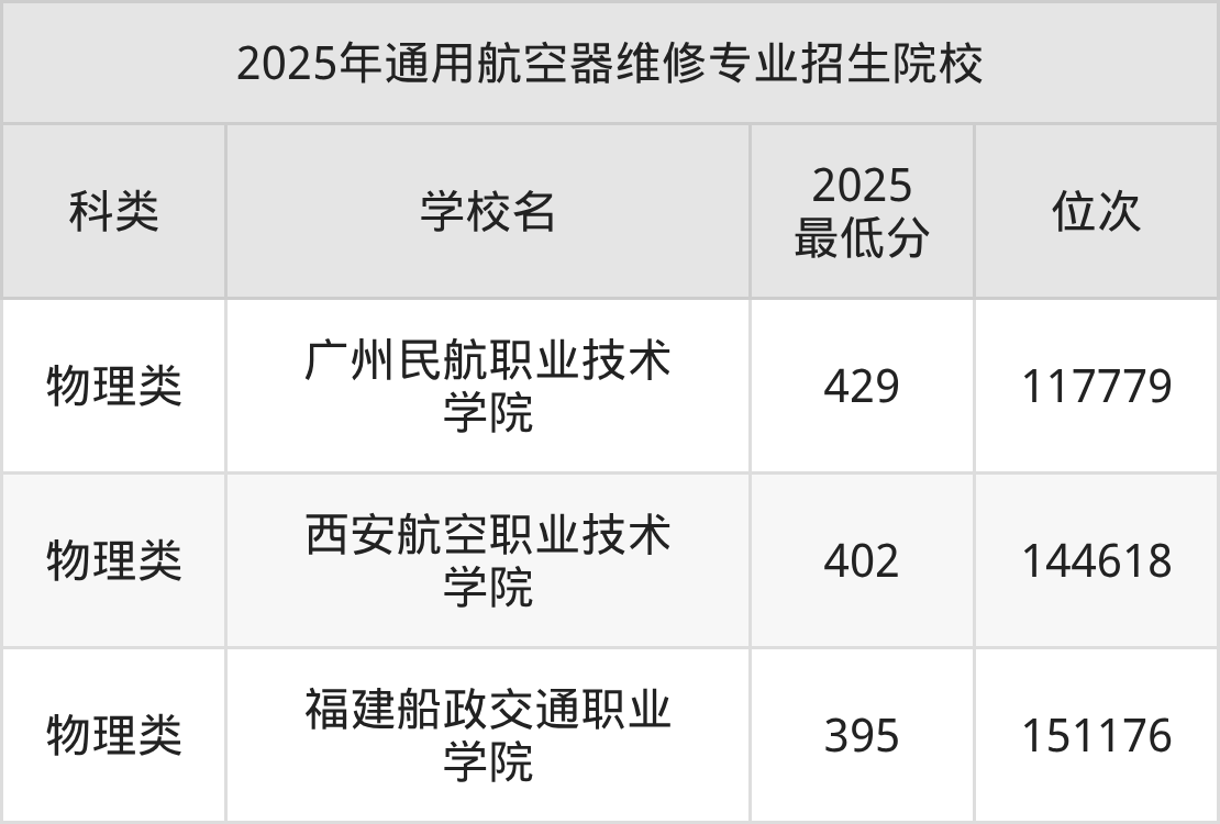 因为各校在不同省市区的收分不一样,为方便对比,这里以贵州省高考为例,列举上述院校2025年在贵州通用航空器维修招生分数情况。