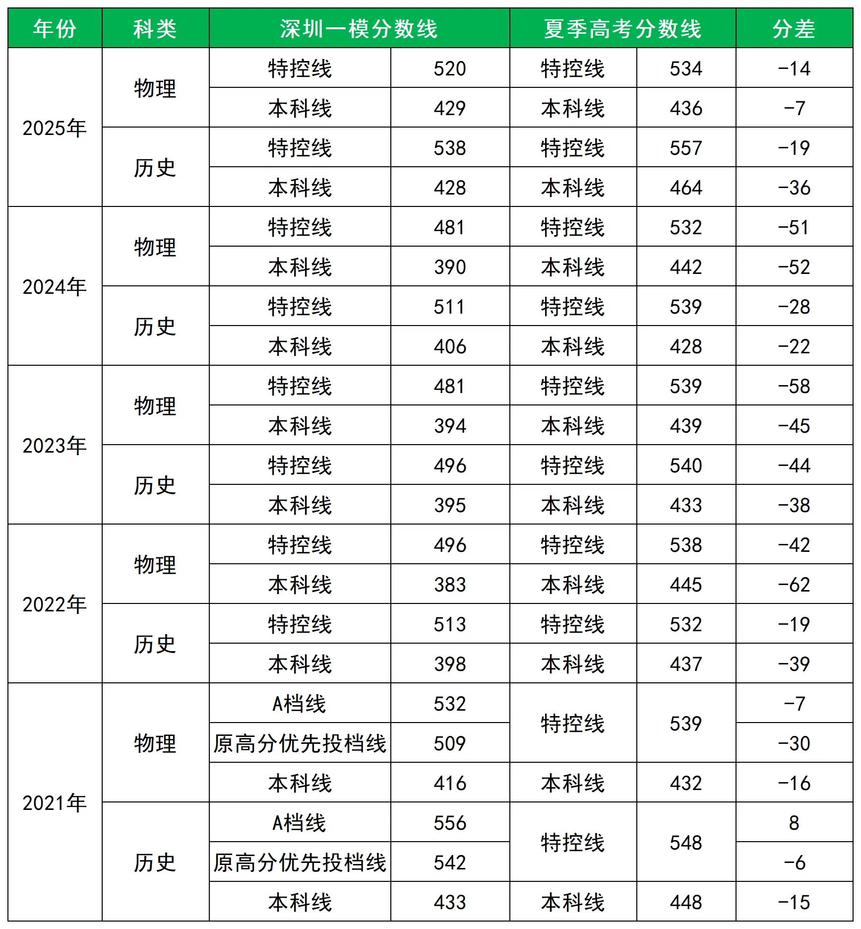 近五年深一模分数线及高考分数线对比一览表如下: