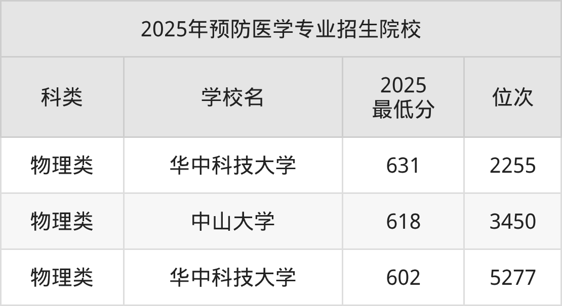 数据显示,预防医学最好大学的收分在602分及以上,其中华中科技大学最低分达到了631分,对应最低位次为2255名。