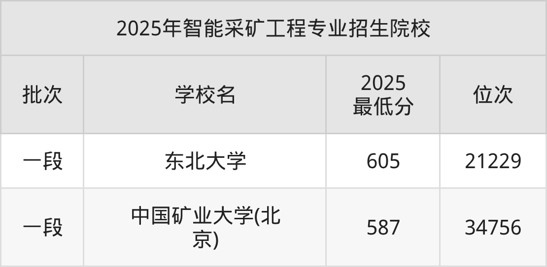 数据显示,智能采矿工程最好大学的收分在587分及以上,其中东北大学最低分达到了605分,对应最低位次为21229名。