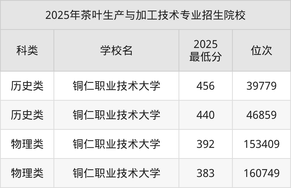 数据显示,茶叶生产与加工技术最好大学的收分在383分及以上,其中铜仁职业技术大学(乡村振兴专干班)最低分达到了456分,对应最低位次为39779名。