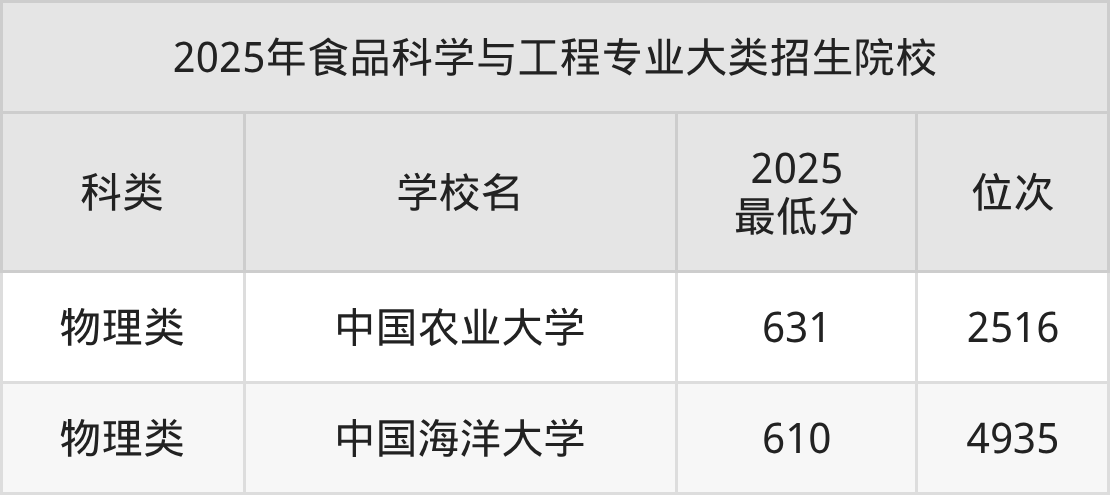 数据显示2025年中国农业大学和中国海洋大学主要是以食品科学与工程大类进行招生的,而食品科学与工程最好大学的收分在610分及以上,其中中国农业大学最低分达到了631分,对应最低位次为2516名。