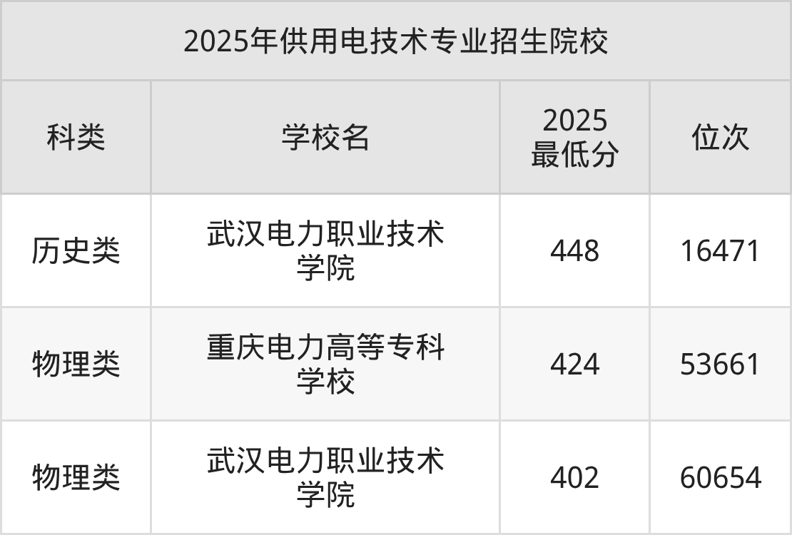 数据显示,供用电技术最好大学的收分在402分及以上,其中武汉电力职业技术学院最低分达到了448分,对应最低位次为16471名。