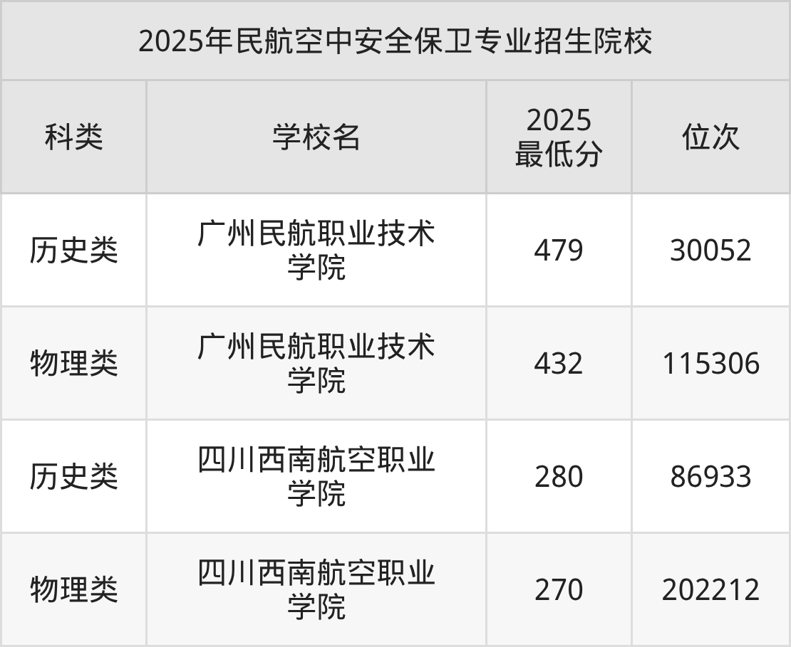 因为各校在不同省市区的收分不一样,为方便对比,这里以贵州省高考为例,列举上述院校2025年在贵州民航空中安全保卫招生分数情况。