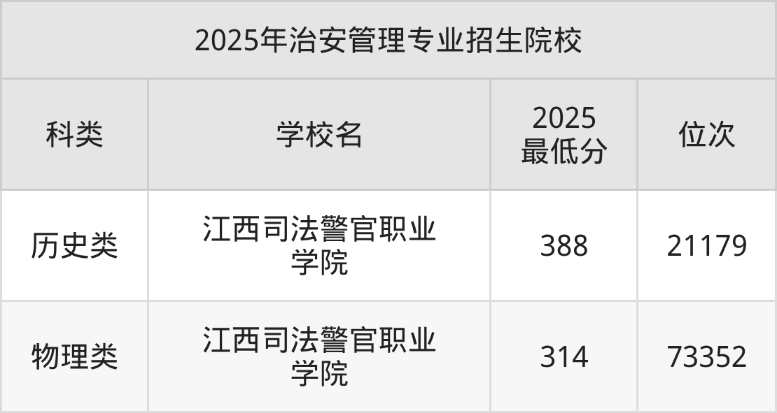 数据显示,治安管理最好大学的收分在314分及以上,其中江西司法警官职业学院最低分达到了388分,对应最低位次为21179名。