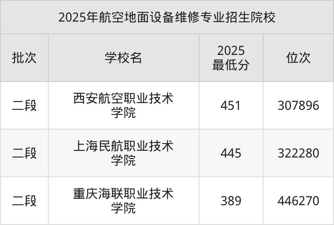 数据显示,航空地面设备维修最好大学的收分在389分及以上,其中西安航空职业技术学院最低分达到了451分,对应最低位次为307896名。