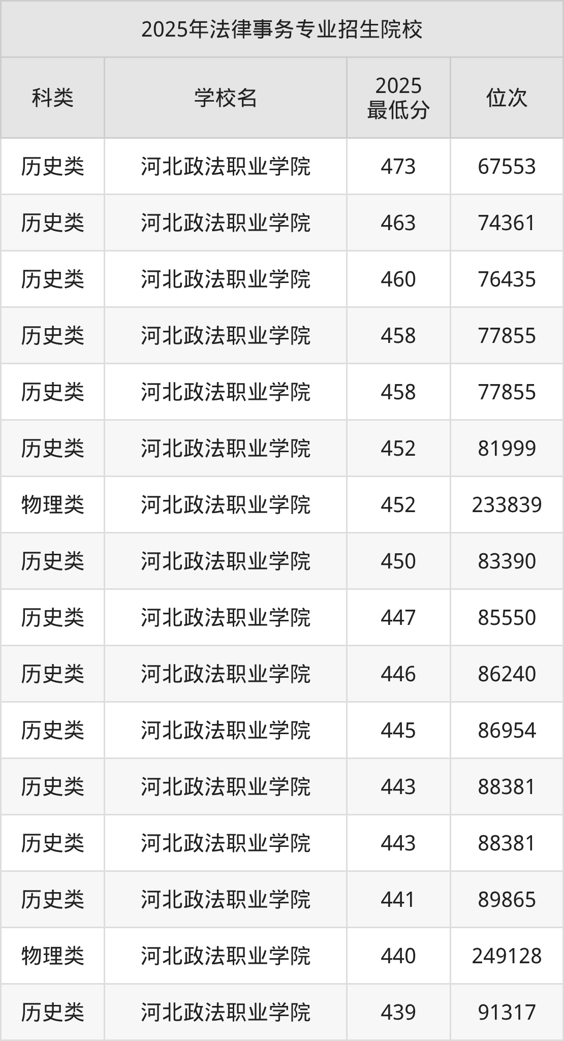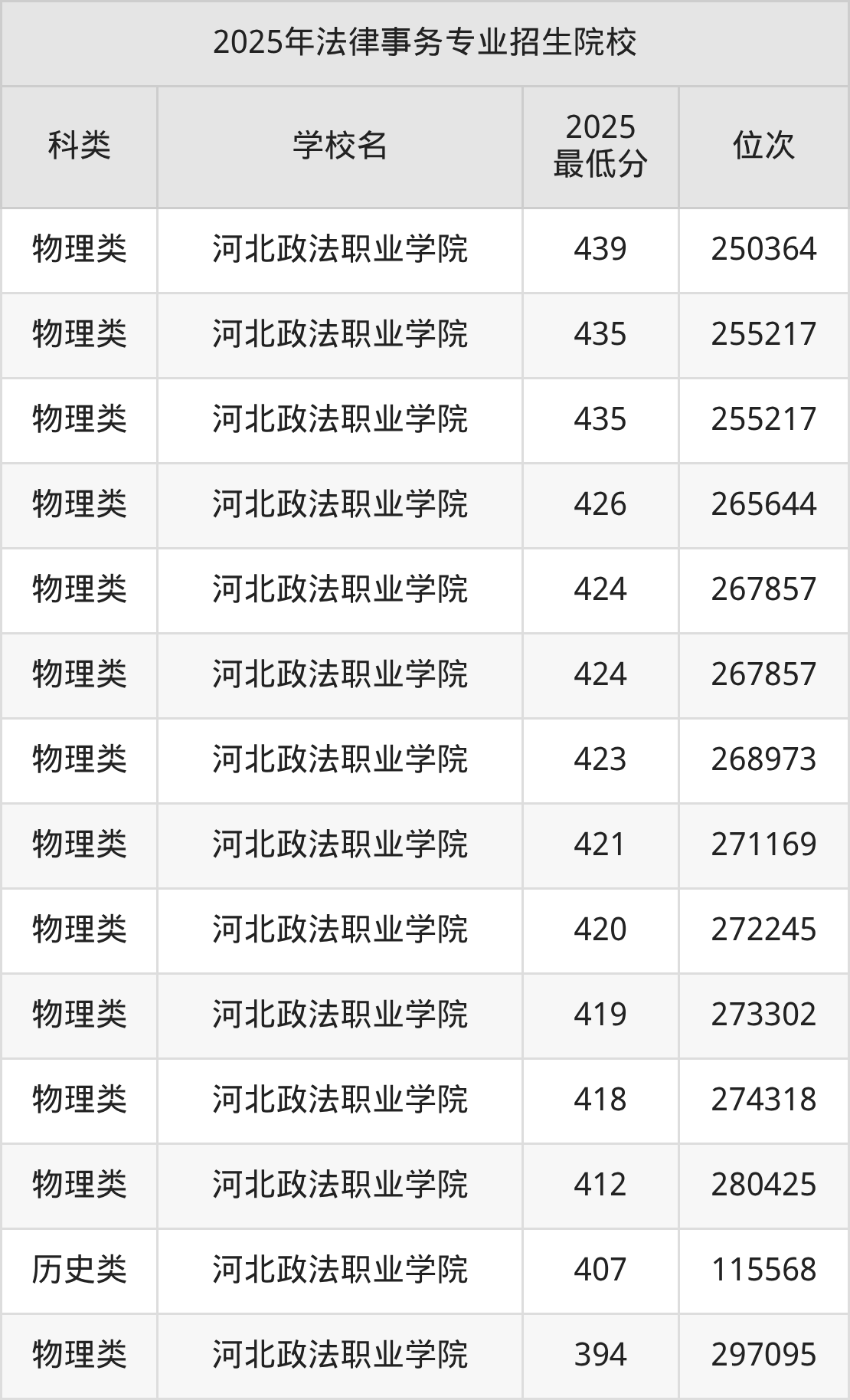 因为各校在不同省市区的收分不一样,为方便对比,这里以河北省高考为例,列举上述院校2025年在河北法律事务招生分数情况。
