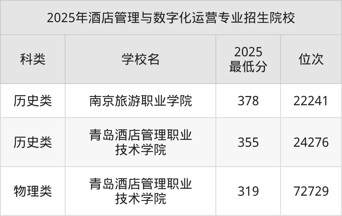 数据显示,酒店管理与数字化运营最好大学的收分在319分及以上,其中南京旅游职业学院最低分达到了378分,对应最低位次为22241名。