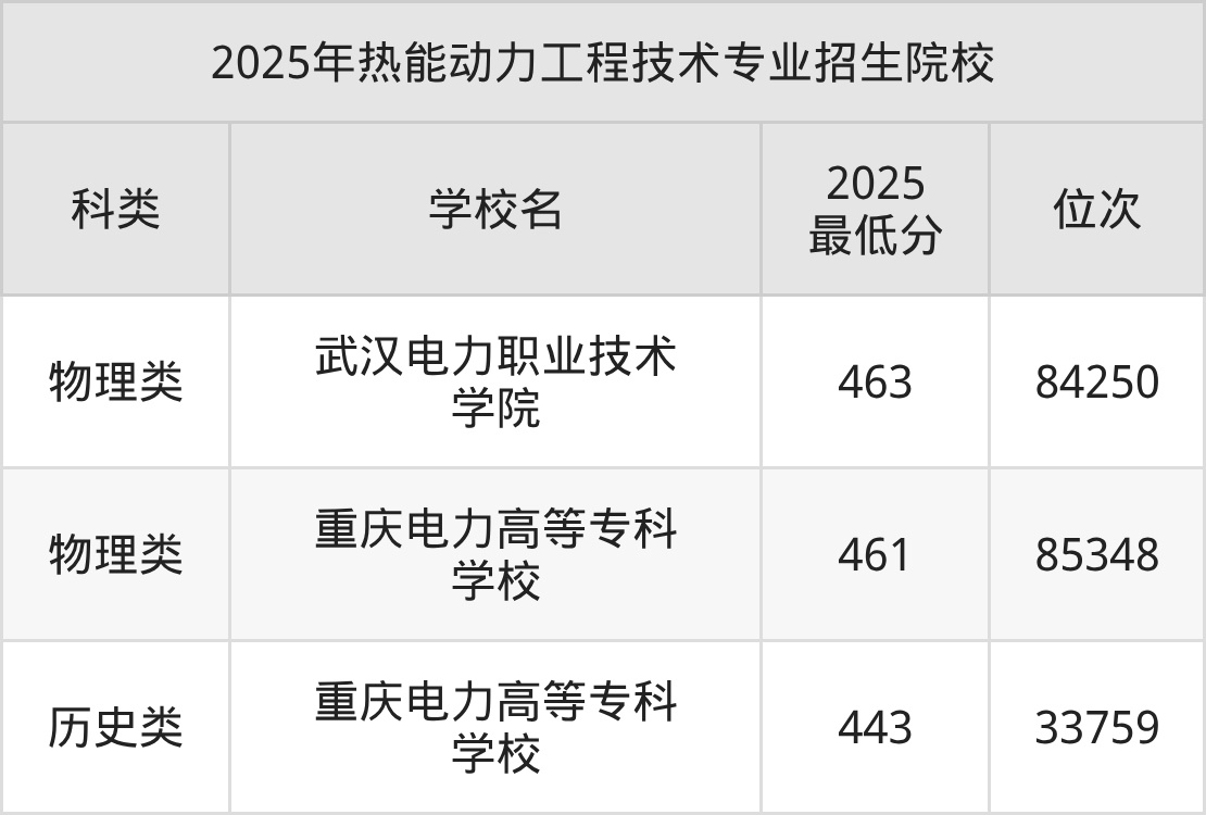 数据显示,热能动力工程技术最好大学的收分在443分及以上,其中武汉电力职业技术学院最低分达到了463分,对应最低位次为84250名。