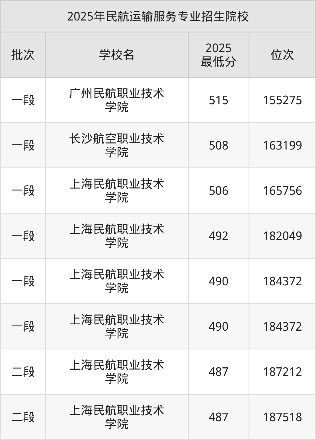数据显示,民航运输服务最好大学的收分在487分及以上,其中广州民航职业技术学院最低分达到了515分,对应最低位次为155275名。