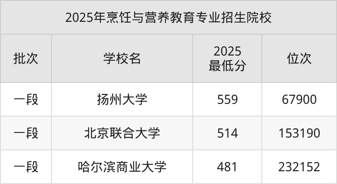 数据显示,烹饪与营养教育最好大学的收分在481分及以上,其中扬州大学最低分达到了559分,对应最低位次为67900名。