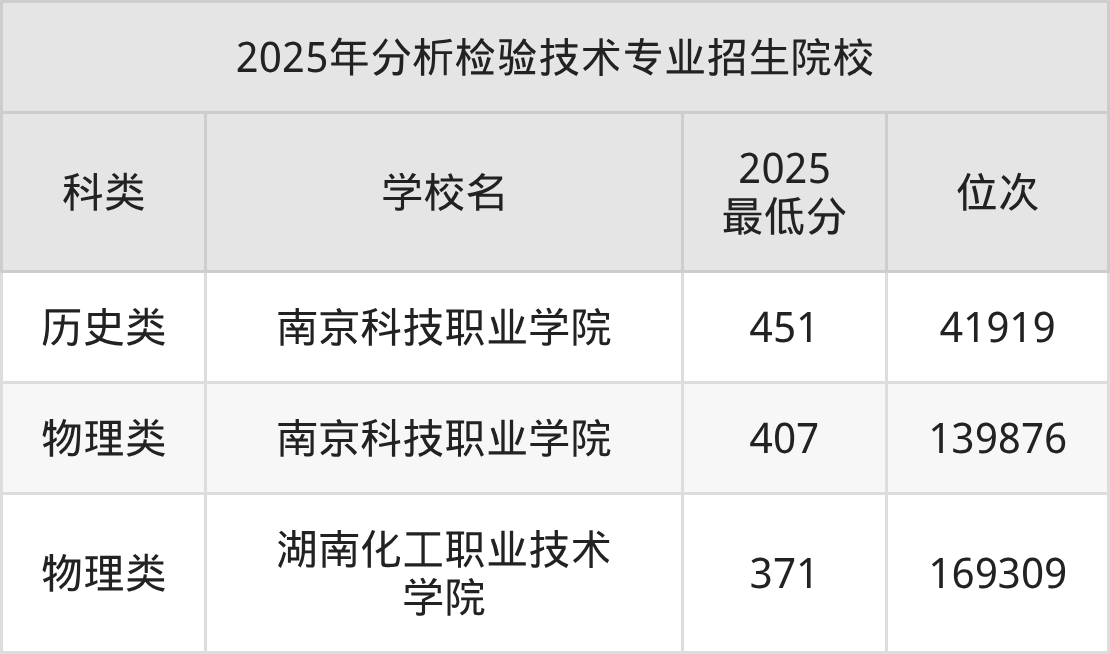 数据显示,分析检验技术最好大学的收分在371分及以上,其中南京科技职业学院最低分达到了451分,对应最低位次为41919名。