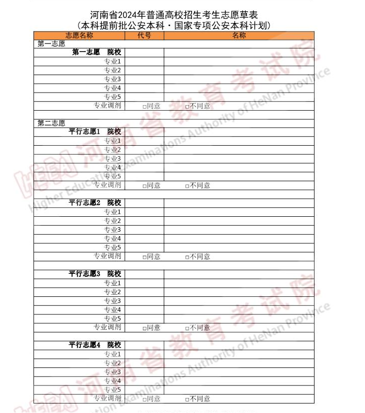 根据2024年河南省高考志愿草表显示,本科提前批公安本科实行顺序志愿和平行志愿,共可填报5个院校专业组志愿,每个专业组内包含5个专业志愿以及是否服从志愿。第二志愿中的4个院校专业组志愿全部实行平行志愿。
