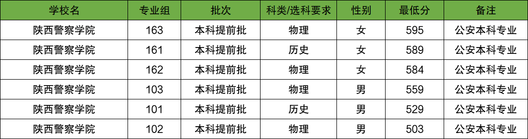 2025年该校公安类专业在陕西提前批招生分数中,女生分数最高的是163专业组,2025年最低录取分为595分;女生分数最低的是162专业组,2025年最低录取分为584分。