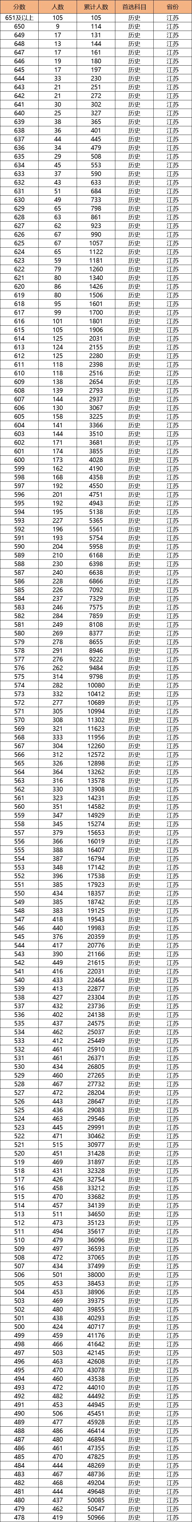 历史类:651分对应全省第105名,551分对应17923名,491分对应44945名;