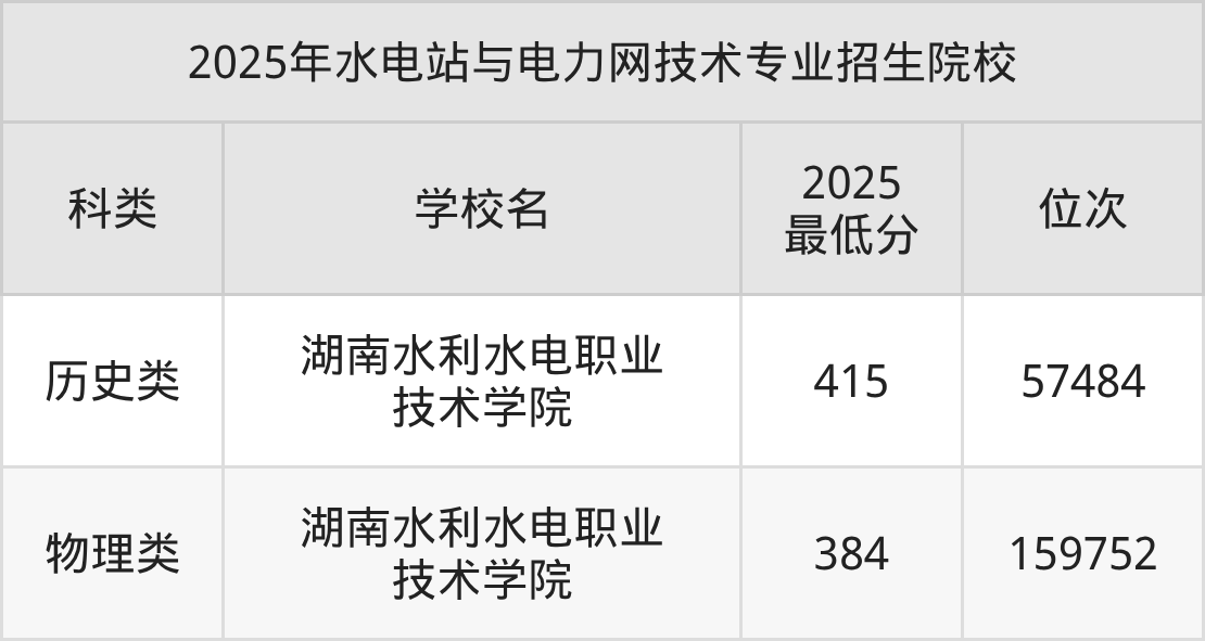 数据显示,水电站与电力网技术最好大学的收分在384分及以上,其中湖南水利水电职业技术学院最低分达到了415分,对应最低位次为57484名。