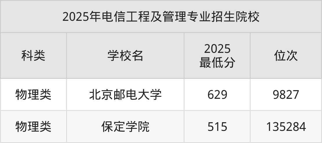 因为各校在不同省市区的收分不一样,为方便对比,这里以河北省高考为例,列举上述院校2025年在河北电信工程及管理招生分数情况。