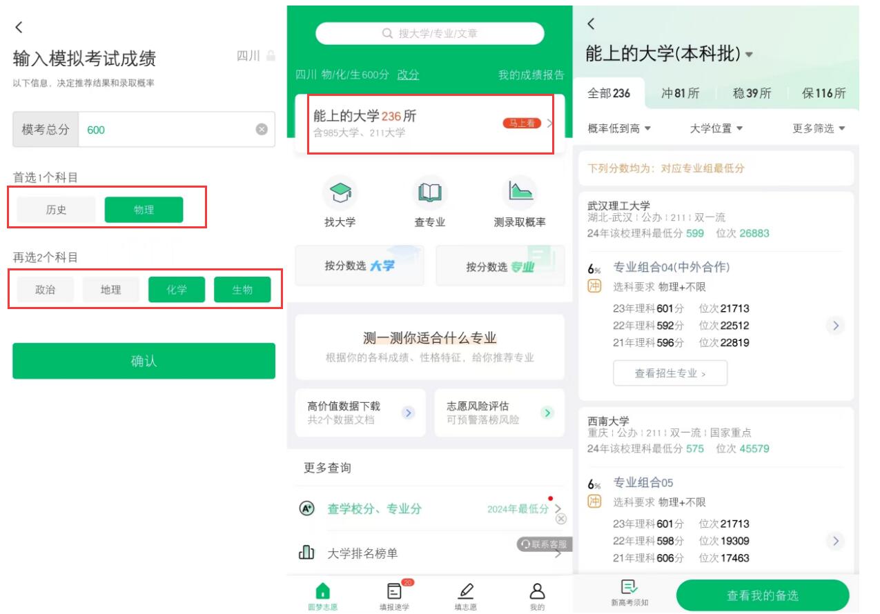 考生在圆梦志愿输入分数即可获得能上的大学名单,每一所都有预估概率,考生可直接根据圆梦志愿APP给出的冲稳保比例进行选择。比如四川物化政600分,通过圆梦志愿APP匹配到能上的一共有236所,其中包括985大学、211大学等。