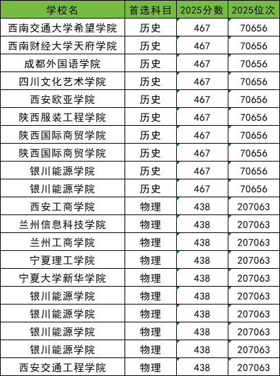 2025年四川历史类民办二本大学最低录取分数线是467分,收分最低的大学有陕西国际商贸学院、银川能源学院等院校;物理类民办二本大学最低分是438分,收分最低的大学是西安交通工程学院、西安科技大学高新学院等院校。