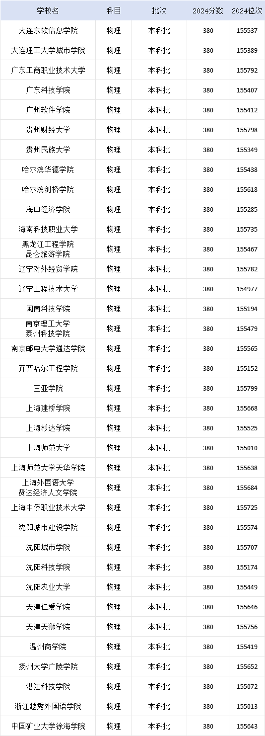 以物理类本科线为例,该分数位次排名154331名~155792名;对应的学校有:闽南科技学院、南京理工大学泰州科技学院、南京邮电大学通达学院、齐齐哈尔工程学院、三亚学院等。