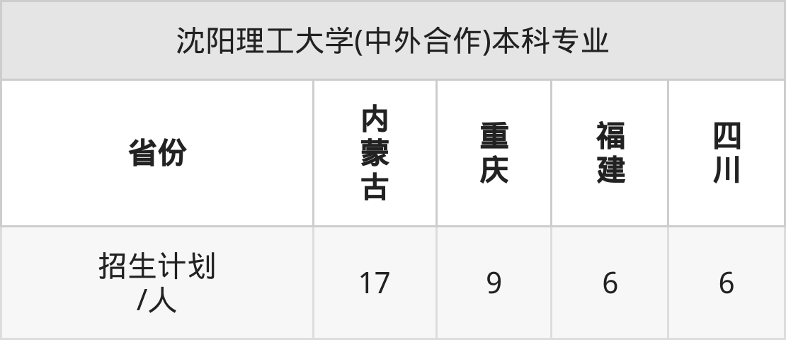 沈阳理工大学(中外合作)面向重庆(9人)、福建(6人)、四川(6人)、内蒙古(17人)开展本科招生。招生批次为本科批。