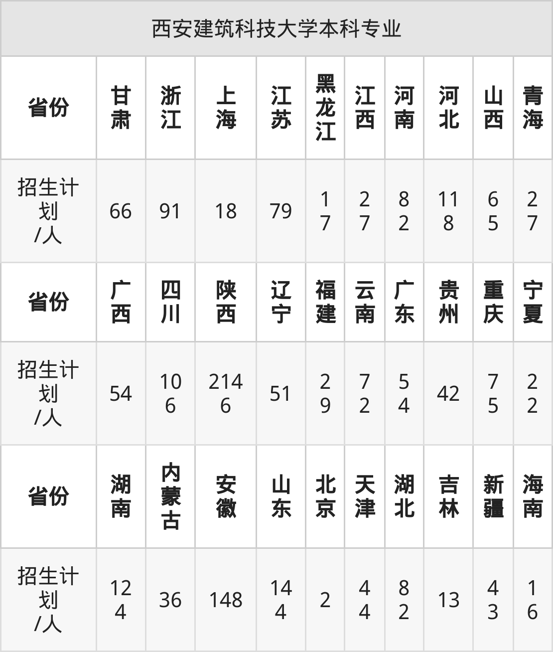 西安建筑科技大学面向重庆(75人)、福建(29人)、宁夏(22人)、青海(27人)、甘肃(66人)、江苏(79人)、湖北(82人)等30个地区开展本科招生。其中青海招生批次为本科一段,内蒙古、新疆、河南、陕西、四川招生批次为本科一批,其余省份为本科批。