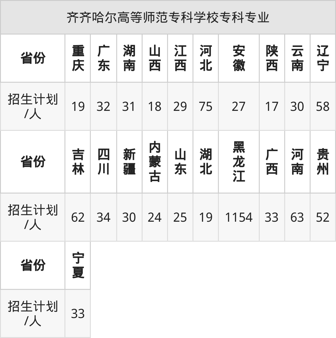 齐齐哈尔高等师范专科学校面向江西(29人)、湖南(31人)、广东(32人)、广西(33人)、陕西(17人)、河北(75人)、山西(18人)等21个地区开展专科招生。其中山东招生批次为二段,其余省份为专科批。