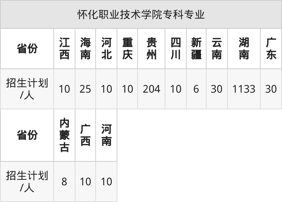 怀化职业技术学院面向广东(30人)、内蒙古(8人)、河南(10人)、湖南(1133人)、重庆(10人)、贵州(204人)、四川(10人)等13个地区开展专科招生。招生批次为专科批。