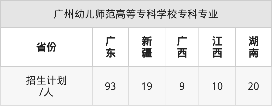 广州幼儿师范高等专科学校面向湖南(20人)、广东(93人)、新疆(19人)、广西(9人)、江西(10人)开展专科招生。招生批次为专科批。