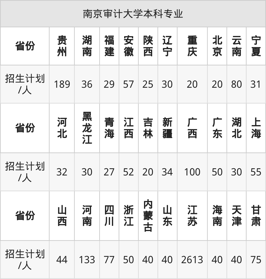 南京审计大学面向吉林(20人)、江西(52人)、山西(44人)、广西(100人)、陕西(25人)、新疆(34人)、江苏(2613人)等30个地区开展本科招生。其中青海招生批次为本科一段,内蒙古、新疆、河南、四川、陕西招生批次为本科一批,其余省份为本科批。