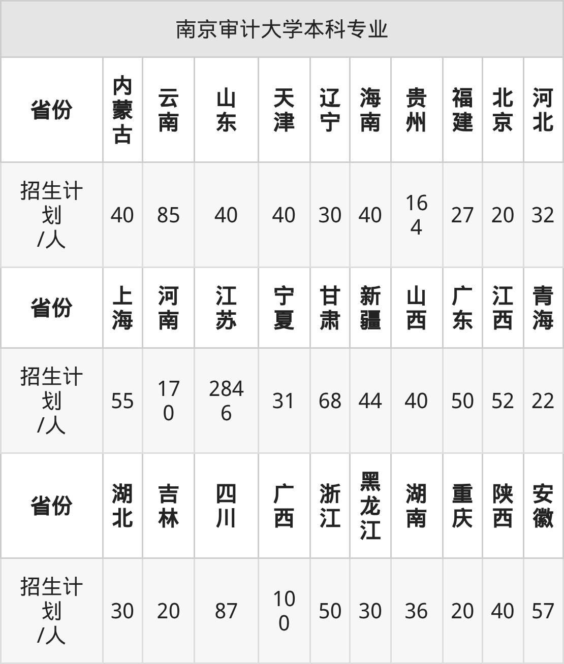南京审计大学面向贵州(164人)、吉林(20人)、湖南(36人)、海南(40人)、福建(27人)、内蒙古(40人)、辽宁(30人)等30个地区开展本科招生。其中山东招生批次为一段,宁夏、云南、四川招生批次为本科批B段,其余省份为本科批。