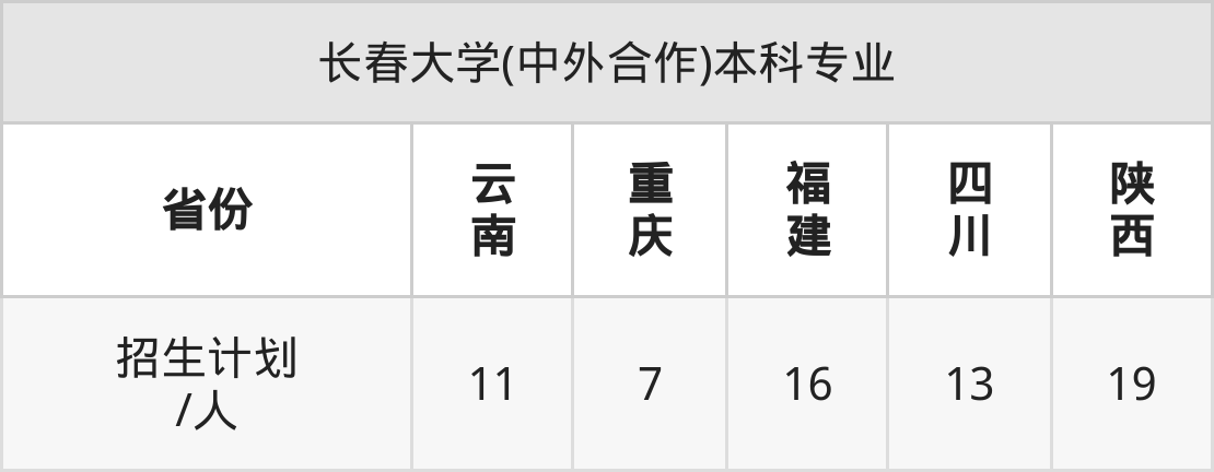 长春大学(中外合作)面向重庆(7人)、福建(16人)、四川(13人)、陕西(19人)、云南(11人)开展本科招生。其中云南招生批次为二本,其余省份为本科二批。