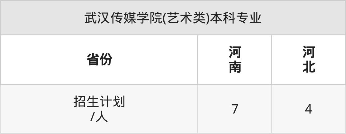 武汉传媒学院(艺术类)面向河南(7人)、河北(4人)开展本科招生。招生批次为本科批。