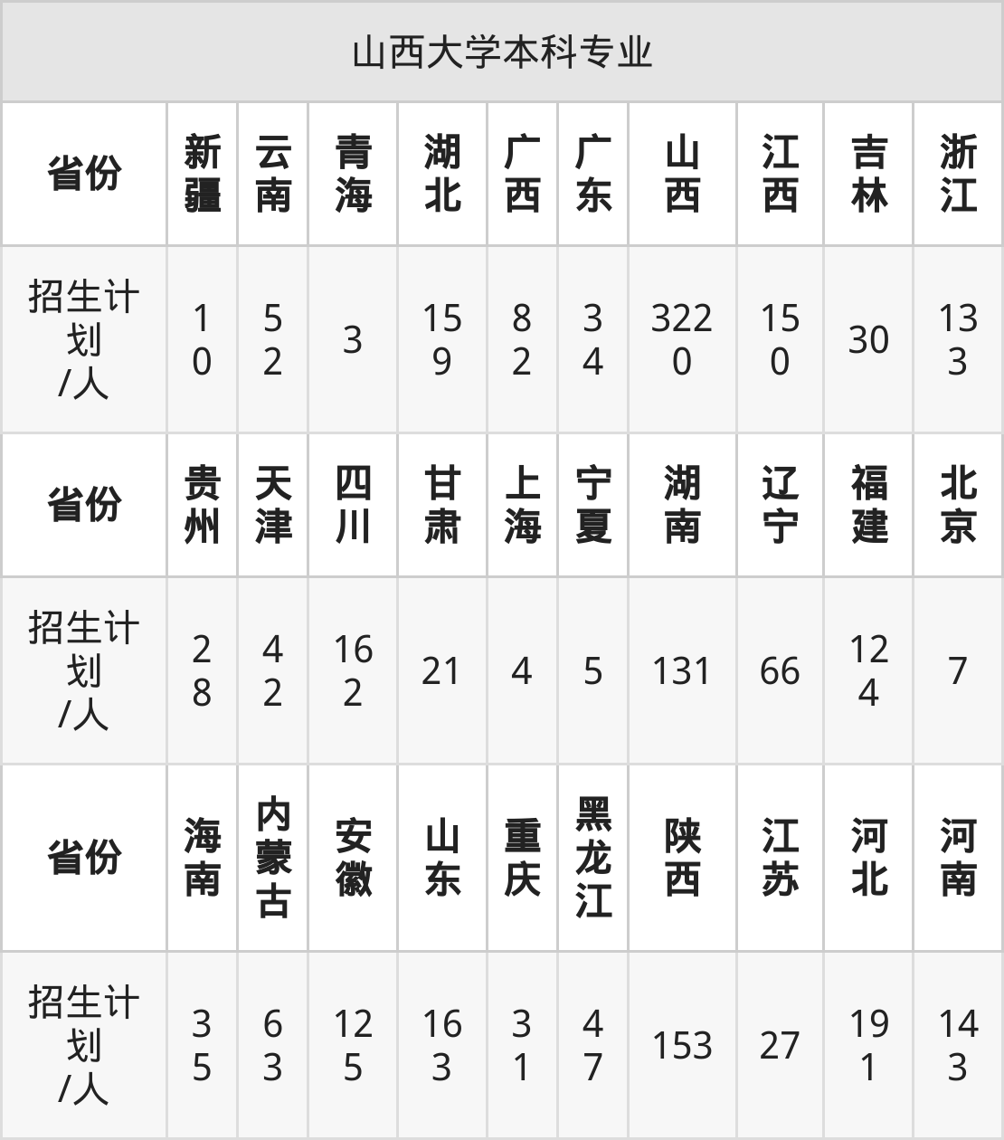 山西大学面向甘肃(21人)、重庆(31人)、浙江(133人)、黑龙江(47人)、贵州(28人)、福建(124人)、海南(35人)等30个地区开展本科招生。其中青海招生批次为本科一段,陕西、内蒙古、河南、四川招生批次为本科一批,其余省份为本科批。
