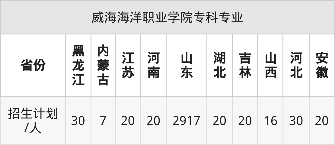 威海海洋职业学院面向江苏(20人)、吉林(20人)、安徽(20人)、山西(16人)、河北(30人)、黑龙江(30人)、内蒙古(7人)等10个地区开展专科招生。其中山东招生批次为二段,其余省份为专科批。