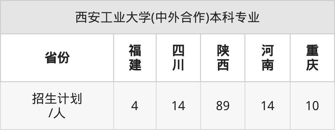 西安工业大学(中外合作)面向福建(4人)、四川(14人)、陕西(89人)、河南(14人)、重庆(10人)开展本科招生。其中重庆、福建招生批次为本科批,其余省份为本科一批。
