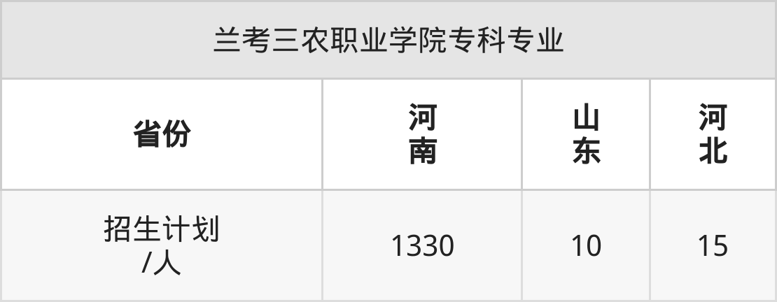 兰考三农职业学院面向河南(1330人)、山东(10人)、河北(15人)开展专科招生。其中山东招生批次为二段,其余省份为专科批。