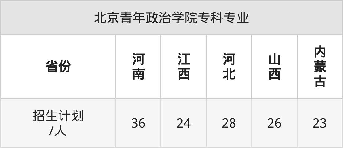 北京青年政治学院面向河南(36人)、江西(24人)、河北(28人)、山西(26人)、内蒙古(23人)开展专科招生。招生批次为专科批。
