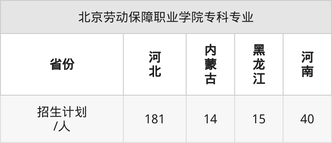 北京劳动保障职业学院面向河北(181人)、内蒙古(14人)、黑龙江(15人)、河南(40人)开展专科招生。招生批次为专科批。